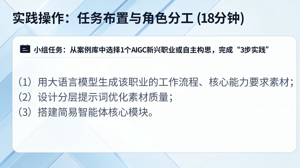 高中阶段,金丽琴老师聚焦 “智能时代职业创新”,以AIGC驱动新兴职业场景模拟的设计与实践为任务,引导学生掌握分层提示词设计、简易智能体搭建、深度校验与创新等技能,深化对技术原理与社会价值的辩证认知。课程强调创新实践与系统思维,引导学生开展智能体搭建与跨模态创作,体现学段间的衔接与进阶。