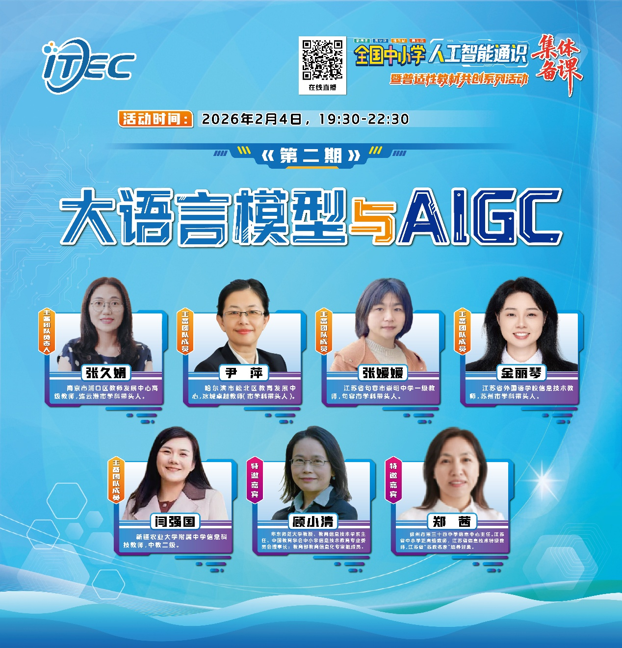 为持续推动人工智能通识教育落地实施,加强教研生态共建与教师专业协同,2026年2月4日晚,中国教育学会中小学信息技术教育专业委员会成功举办第二期全国中小学人工智能通识集体备课暨普适性教材共创活动,巫雪琴、郑茜等多个名师工作室联合承办、全国各参与省市名师工作室协办,共同破解人工智能通识教育落地难题,推动课程体系化建设与教师专业发展。