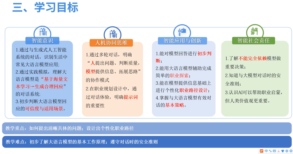 小学阶段,尹萍老师以 “用大语言模型规划职业之路” 为主题,立足四年级学生认知特点,通过情境体验、模型体验、创意设计等方式,设计对应环节的问题链,引导学生感知大语言模型的功能与边界,掌握基础提示词设计方法,树立安全使用AI的意识。课程还形成了综合评价反馈体系与课后延伸实践任务,侧重体验与兴趣培养,引导学生在互动中感知AI工具。