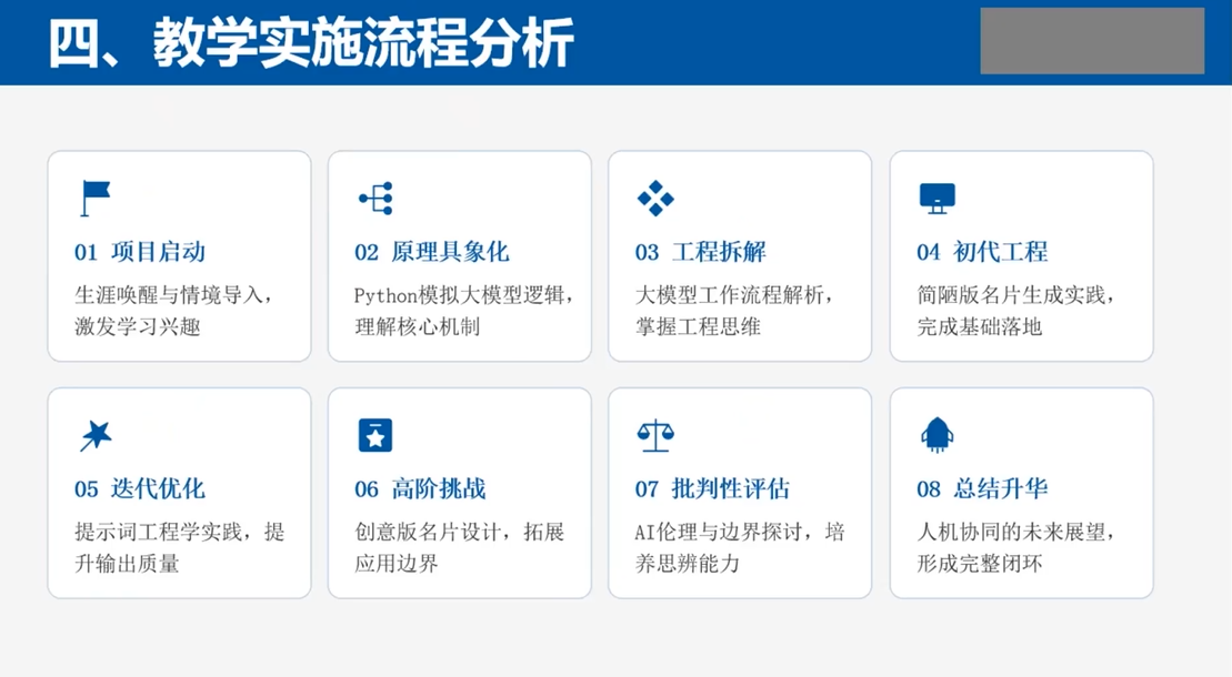 初中阶段,张媛媛老师围绕 “设计未来职业名片” 展开项目式学习,借助Python代码类比、工作流程拆解、迭代优化与高阶挑战等具象化手段,帮助学生理解大语言模型AIGC的底层工作逻辑,提升提示词优化与多模态内容创作能力,将抽象的技术原理具象化,并发展工程思维与批判意识。