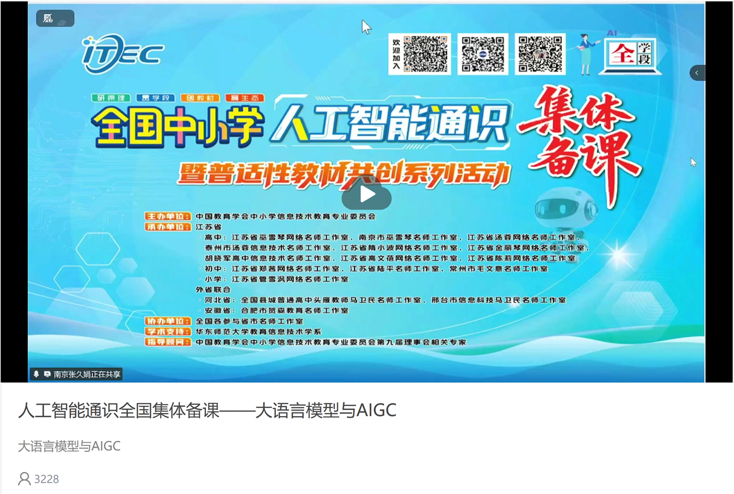 本次活动由南京市浦口区教师发展中心张久娟老师主持,中国教育学会中小学信息技术教育专委会理事长顾小清教授、徐州市第三十四中学信息中心主任郑茜教授等出席,来自全国各地的信息科技教师及教育专家近3000多人齐聚云端,共同围绕"大语言模型与AIGC"主题开展深度教研。主备团队经张久娟老师带头,由金丽琴(高中)、张媛媛(初中)、闫强国(初中)、尹萍(小学),共5位老师组成。