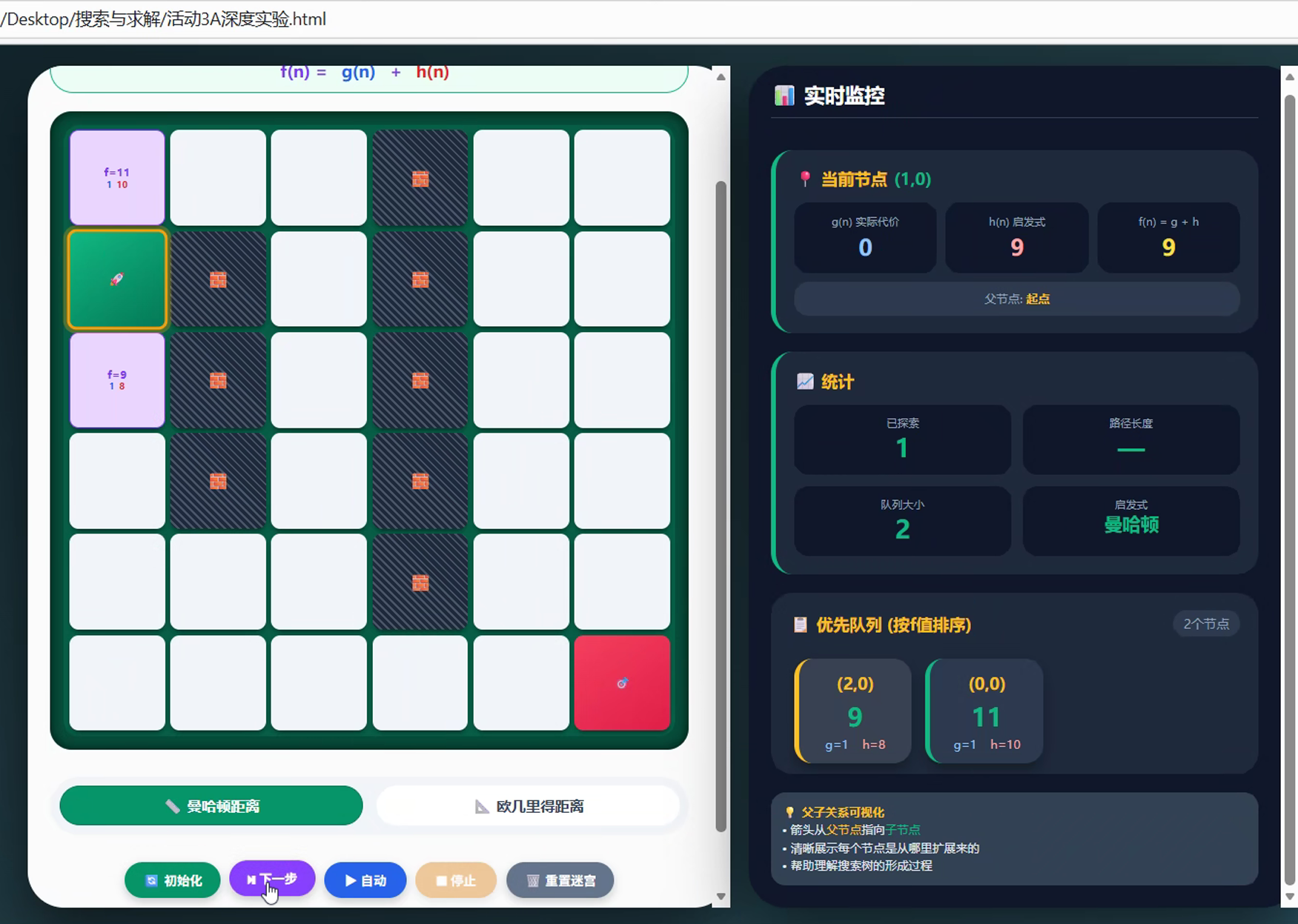 蒋蔚老师以“校园导航APP项目开发”这一真实情境,呈现了一场抽丝剥茧的高中深度课例。两个课时层层递进,第一课时引导学生对比盲目搜索与启发式搜索的差异,通过可视化实验平台直观感受A算法的方向性优势;第二课时深入剖析A算法的核心机制,学生动手计算曼哈顿距离、理解F值排序、探究启发函数权重的影响。最后通过引导学生辩证思考“最短路径”与“最佳路径”的差异,探讨无障碍导航、拥堵规避等现实问题,引导学生跳出技术看社会,将算法学习内化为强烈的社会责任意识。