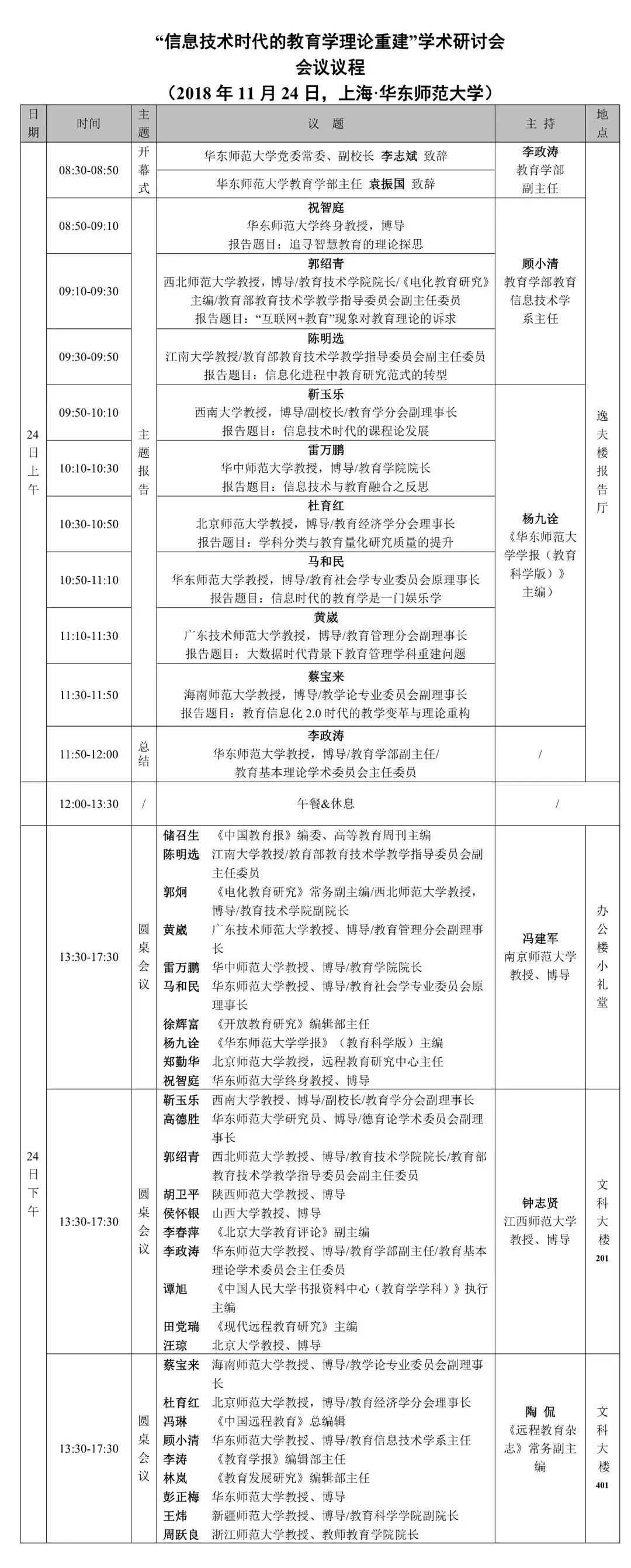 将于2018年11月24日在华东师范大学中北校区召开的“信息技术时代的教育学理论重建学术研讨会”日前公布了会议议程